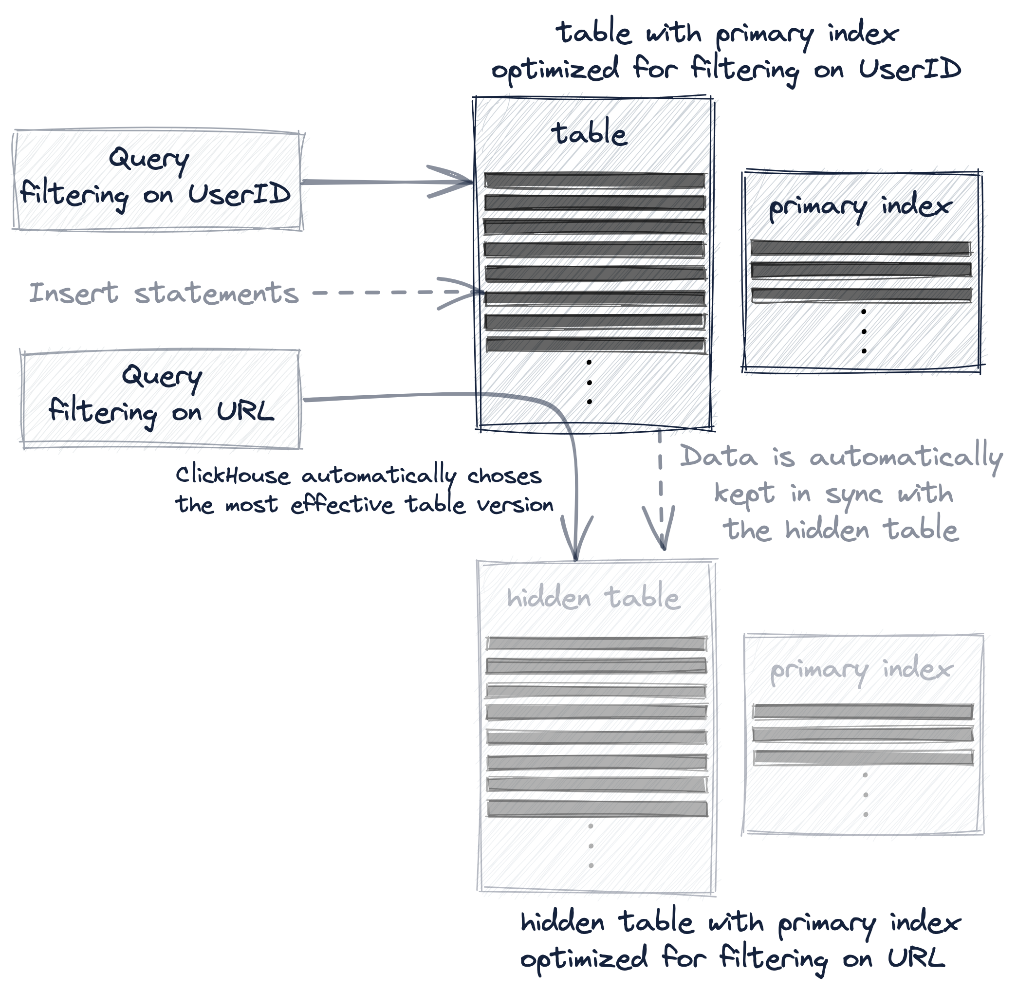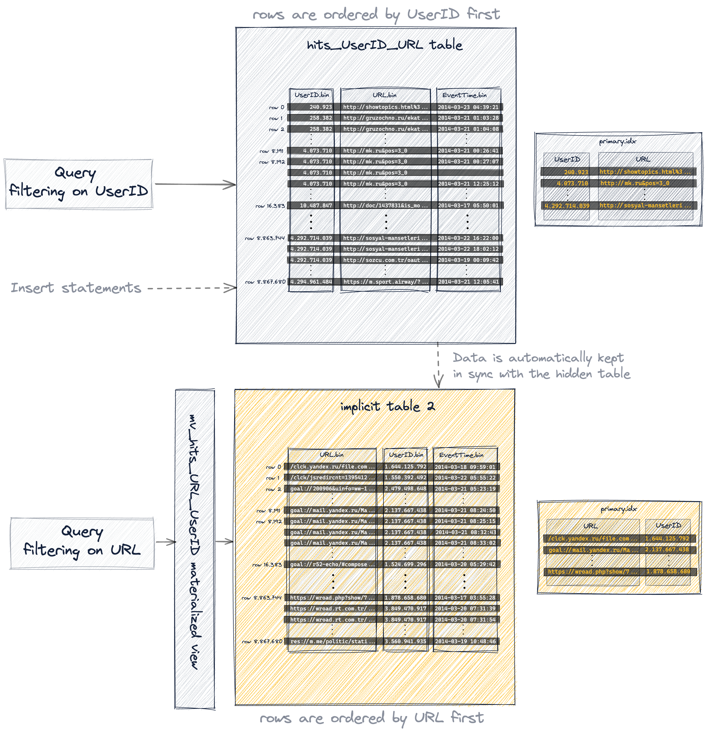 • a query is always (syntactically) targeting the source table hits_UserID_URL, but if the row order and primary index of the hidden table allows a more effective query execution, then that hidden table will be used instead