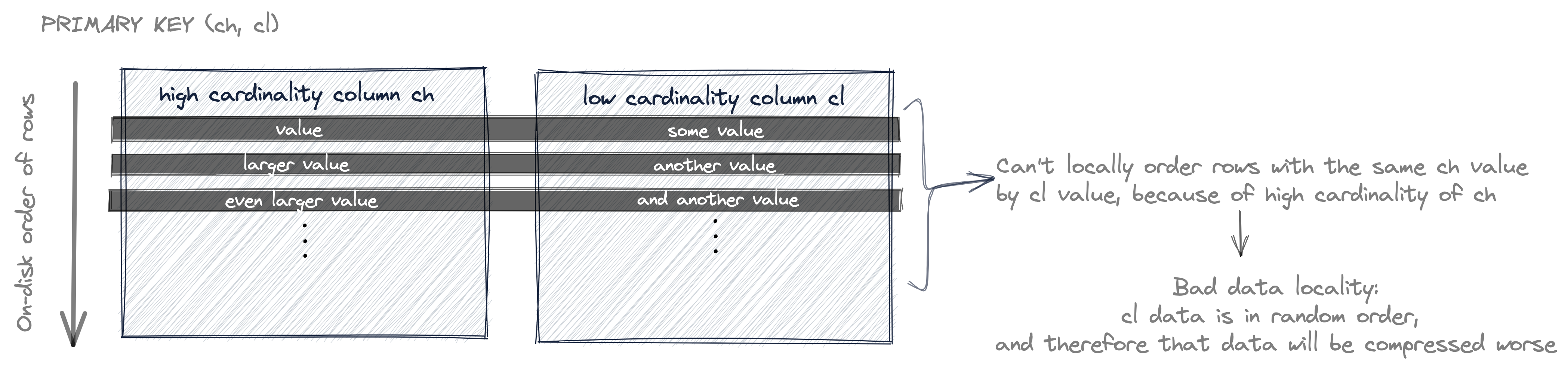 Now the table's rows are first ordered by their ch value, and rows that have the same ch value are ordered by their cl value. But because the first key column ch has high cardinality, it is unlikely that there are rows with the same ch value. And because of that is is also unlikely that cl values are ordered (locally - for rows with the same ch value).